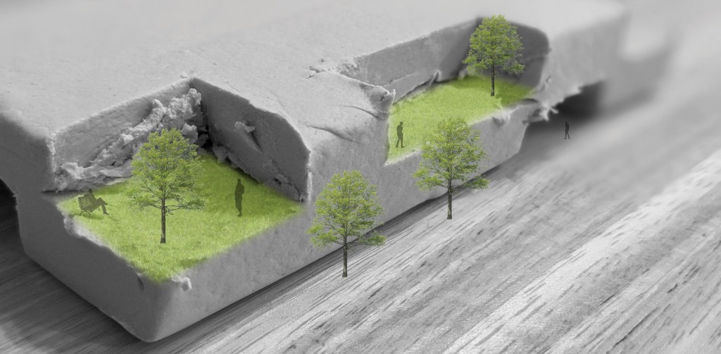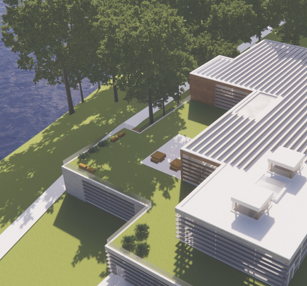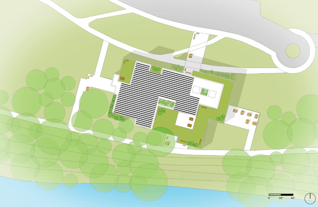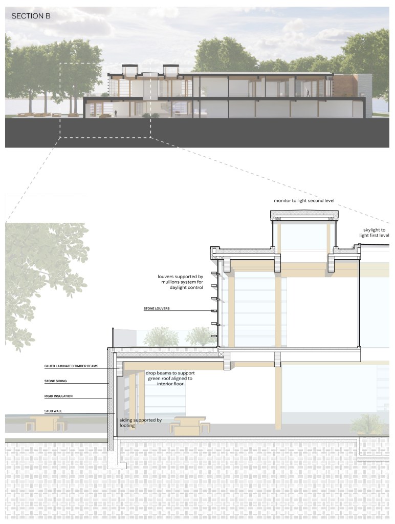 This educational center in East River Flats Park on the east bank of the Mississippi is designed to connect its inhabitants to nature by blurring the physical line between interior and exterior. The interior and exterior push and pull into each other, making use of cuts in floor planes and inhabitable roof areas. This push and pull extends into the site surroundings, and likewise the site surroundings also push into the building and pull away from it.