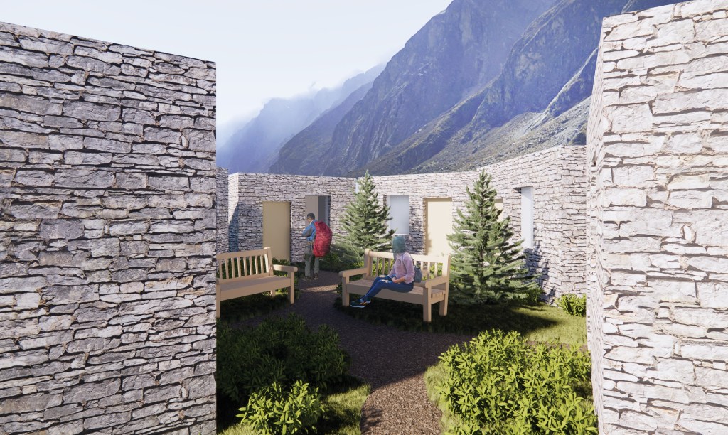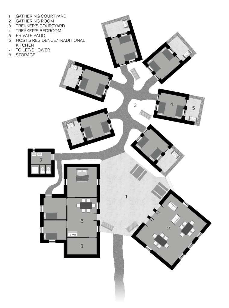 This proposal for an overnight rest stop for alpine trekkers is designed to accomodate trekkers from around the world, their local guides, and also serve as a residence for the local host family. A study of how sequences of spaces are used both by locals and by visitors throughout the day and night was a major conceptual driver for the project.